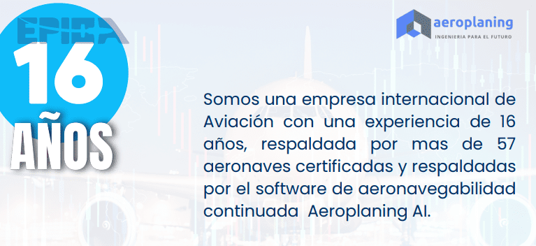 Somos una empresa internacional de Aviación con una experiencia de 16 años, respaldada por mas de 57 aeronaves certificadas y respaldadas por el software de aeronavegabilidad continuada Aeroplaning AI.